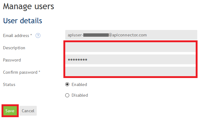4 - On the Manage users screen fill out the password and description field and click save. Make note of your API key. You will need this to complete your registration.